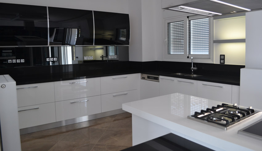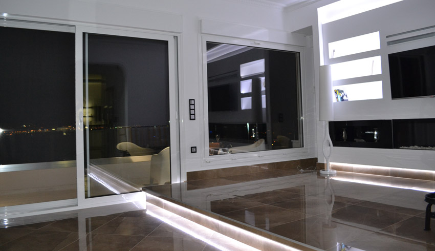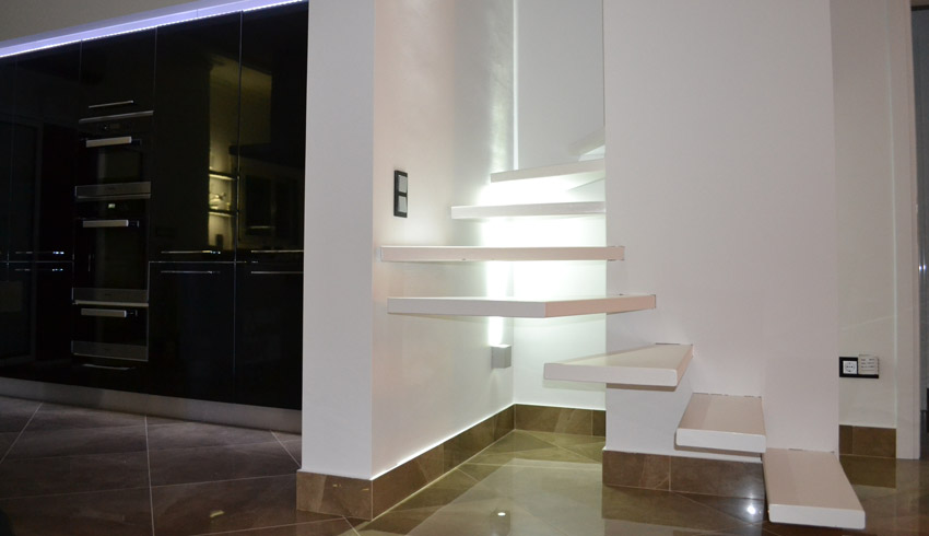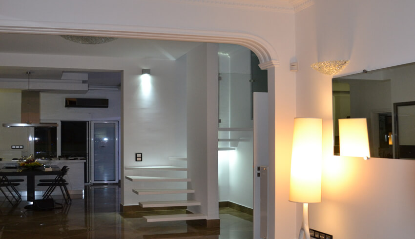 Η κατοικία απέκτησε σύγχρονες, καθαρές γραμμές με έντονες λευκές επιφάνειες σε συνδυασμό με σκούρα στοιχεία, όπως πάγκοι και δρύινα πατώματα. Ο φωτισμός είναι πλήρως ενσωματωμένος (recessed) και ενισχύει τις γραμμικές λεπτομέρειες στους τοίχους και τα ταβάνια.