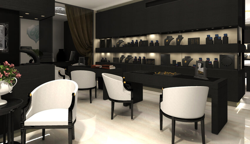 Ο χώρος οργανώνεται σε επίπεδα, με καθορισμένες ζώνες προβολής, εξυπηρέτησης και ιδιωτικής παρουσίασης προϊόντων. Τα καθίσματα και τα τραπέζια υποδοχής παραπέμπουν σε σαλονάκι πολυτελούς οικίας, ενισχύοντας την προσωπική σχέση πελάτη – καταστήματος.Η μελέτη φωτισμού συμπληρώνει την εμπειρία, με φωτιστικά στοιχεία που διαμορφώνουν ήπιες σκιές, εστιάζοντας με ακρίβεια στα κοσμήματα. Το αποτέλεσμα είναι ένας χώρος που συνδυάζει εμπορική αποτελεσματικότητα με αίσθηση ασφάλειας και διακριτικής πολυτέλειας.